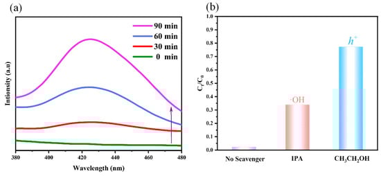 The fluorescent spectrometry with terephthalic acid (TA, 5 × 10−4 mol·L−1) as a probe was used to detect the existence of ∙OH with λex = 315 nm and λem = 340–600 nm. Figure 7a shows that the fluorescent intensity of TA increased continuously at 425 nm along with the time, indicating that the content of ∙OH was increasing. This confirmed the ∙OH in double-cathode system came from the transformation of H2O2 in the PEC process and as the main active substance. In order to further explore the primary active species in the double-cathode system, the trapping examinations were performed in Figure 7b. After capture of ∙OH by IPA, the degradation efficiency of TC decreased obviously, indicating that ∙OH was the dominating role during the PEC degradation of pollutants process. Meanwhile, the degradation efficiency of TC declined 22.6% after trapping h+ by CH3CH2OH, which demonstrated that h+ plays a subsidiary role.