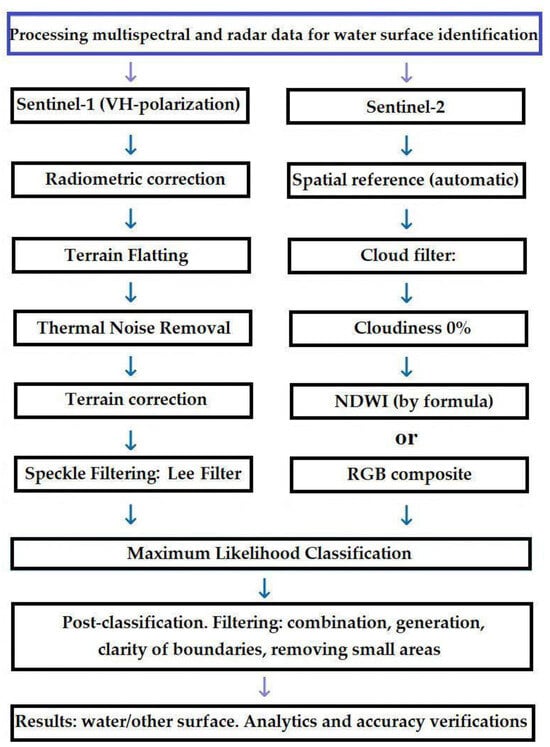 Schematic diagrams of the proposed methodology of remote sensing multispectral (Sentinel-2) and SAR data (Sentinel-1) processing for water surface identification.
