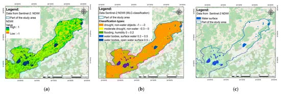 Maps of the identified water surfaces in the test area based on Sentinel-2A/B data at the test area: (a) map with NDWI; (b) map with area classification; (c) map with water surfaces (results obtained).