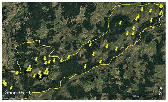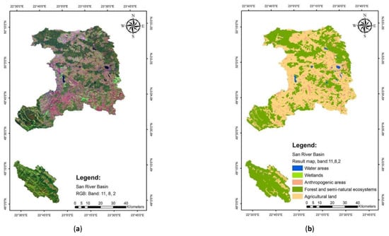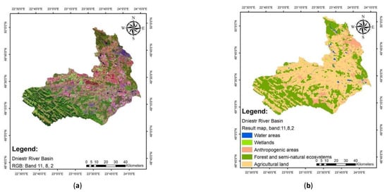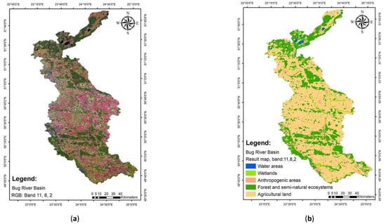 Using the developed method for multispectral data using the NDWI helped to identify and map water surfaces, and using RGB composites helped to highlight water surfaces and wetlands that are potential reservoirs. This research was focused on the identification of sites, whereas all other classes were automatically identified (anthropogenic areas, forests, and agricultural lands). The MLC type of classification obtains better results than the thresholding methods [,], so the use of MLC classification in this study made it possible to distinguish clear land types and obtain clear boundaries of classified areas.