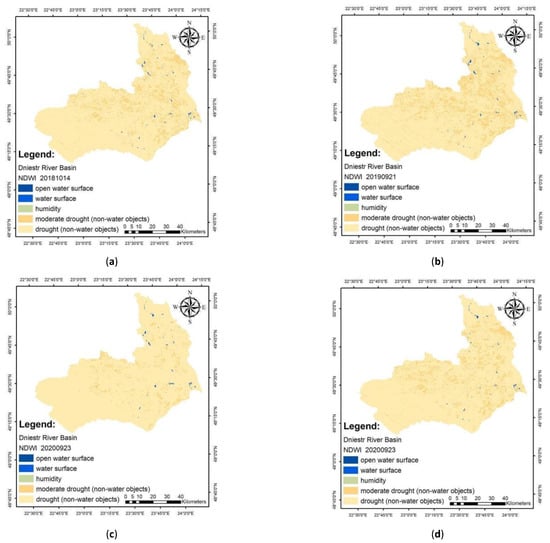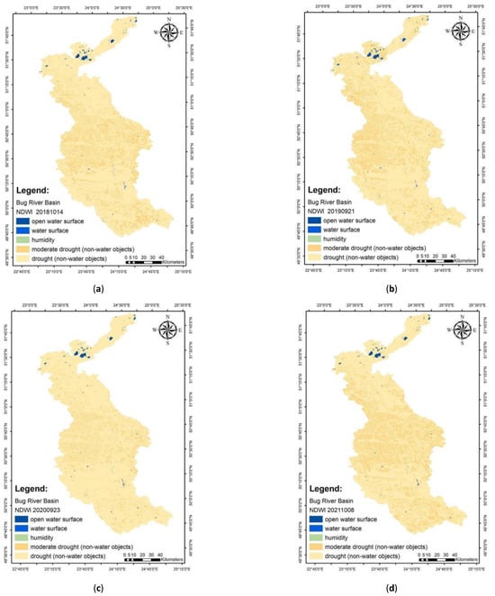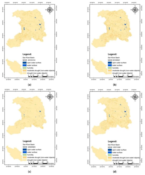 At the next stage of the research, the NDWI was used to build maps with water surfaces in the San River basin area using MLC classification for the dry period of 2018–2021; the results of this mapping are shown in Figure 14a–d.