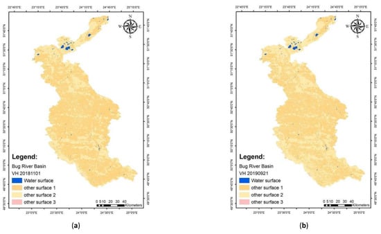 Sentinel-1 C-band SAR devices can operate in the single polarization of HH or VV and the dual polarization of HH + HV or VV + VH; they are implemented through one transmission circuit (switchable to H or V) and two parallel reception circuits for H and V polarization (accessed on 1 June 2022, https://sentinels.copernicus.eu/web/sentinel/user-guides/sentinel-1-sar). To identify water surfaces, VH and VV polarizations are used separately (without formulas) [,,,,,] or in an RGB composite (VV, VH, VH/VV []; RGB: VV, VH, (VV-VH)) [].
