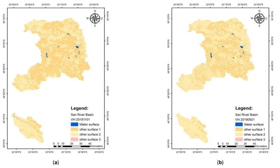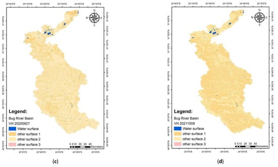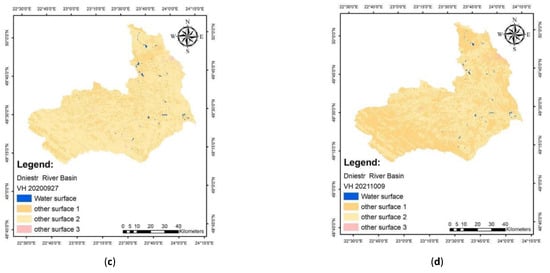 Maps of the San River basin created using Sentinel-1 (SAR) data and using filters (Lee) and MLC classification. Map of classified area types based on VH polarization data for the dry season: (a) November 2018, (b) September 2019, (c) September 2020, and (d) October 2021.