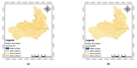 Maps of identified water areas on the test area using SAR data with VH polarization (Lee filter) at the test area: (a) map with classification; (b) map with water surfaces (results obtained).