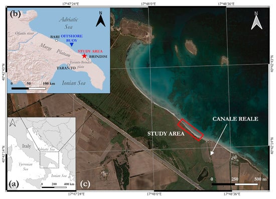 The investigated area falls into a coastal sector that is included in the Torre Guaceto site, a marine protected area (MPA) on the Adriatic flank of the Apulian Region in Italy. The site represents a highly sensitive area in terms of coastal habitats and ecological relevance. For this reason, a special protection area (IT9140008 “Torre Guaceto”) and site of community importance (IT9140005 “Torre Guaceto e Macchia San Giovanni”) were established in 2000. The site is also a renowned goal for tourist activities and beachgoers during the summer holidays; therefore, the marine environment inside the MPA has been divided in three marine zones with gradual increases in access constraints (Zone C, Zone B, and Zone A—Figure 1). The current coastal morphology of the Torre Guaceto site has been gradually shaped by several events of marine transgression/regression cycles that occurred during the Middle–Late Pleistocene period []. The Adriatic Apulian beaches are affected by the sediment supplies of the Ofanto river, which are subsequently redistributed by the predominant NW–SE longshore current []. This coastal sector, which is a microtidal environment with a narrow foreshore area, is influenced by winds that blow from the NNW and ESE directions and strongly influence wave patterns. The beach sector analyzed in this paper is located 200 m north of the Canale Reale mouth. This stream, 48 km long, crosses between the Murge plateau and the Taranto–Brindisi plain [,] to reach the Adriatic Sea through the MPA carrying a considerable amount of litter, a trend common to other rivers/streams worldwide [].