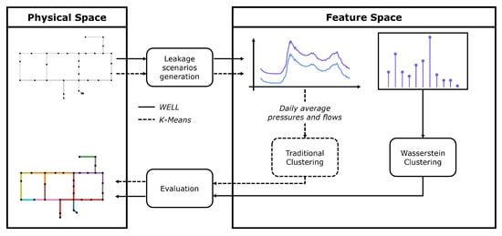 In the present paper, the Wasserstein k-means is used, where the Euclidean distance is replaced by the Wasserstein distance and where centroids are replaced by the barycenters of the distributions belonging to that cluster. As previously seen, each leak scenario can be represented as a set of m point clouds that represent the flow and pressure distributions at the monitoring points. This enables the usage of a Wasserstein-enabled k-means, in which the distance between two leakages is computed as the average Wasserstein distance over the m point clouds associated with different sensors. This approach, namely, Wasserstein-enabled leak localization (WELL), enables the usage of the entire sample of pressures and flows detected during the simulation horizon instead of just considering the average values, as in standard clustering approaches.