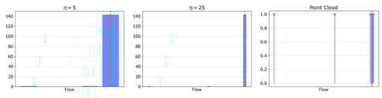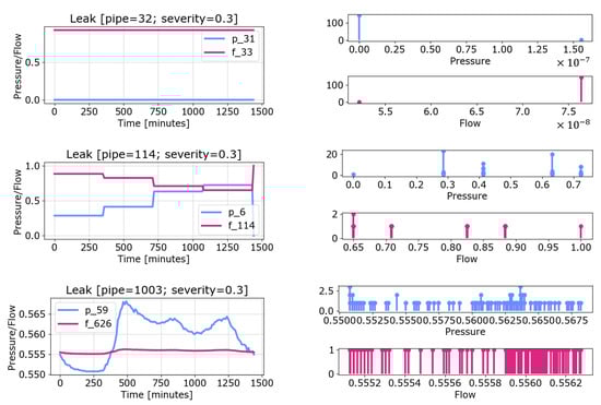 First, a dataset of different leak scenarios is built by simulating a leak on each pipe of the network. Leaks are simulated by splitting a pipe into two sections and adding an emitter node. The demand at that node (i.e., the leaks) is computed as , where p is the pressure, C is the discharge coefficient (severity), and is the pressure exponent. As explained in [25], has been used to simulate a circular hole, and different values of C ranging between and have been considered. The results of each simulation are the pressure and flow values at each junction and pipe, respectively. Only values in correspondence with the monitoring devices are considered. The pressure and flow variations due to each simulated leak are compared to the corresponding values obtained by simulating the faultless network. Each simulated leak is then represented by the pressure and flow variations together with the information related to the affected pipe and the damage severity. The registered values of pressure and flow can be represented as a discrete probability measure, and, in particular, as point clouds. The locations are the pressure or flow values registered during the simulation. Figure 3 shows some examples of pressure and flow variation during the simulation horizon and their representation as point clouds.