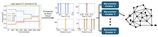 An example of the leak localization prediction flow considering the Anytown water distribution network. A leak is placed on the pipe highlighted with a blue cross; the pressure and flow time series measured at the four monitoring points are converted into point clouds. The point clouds representing the leak are compared with the clusters’ barycenters using the Wasserstein distance. The pipes belonging to the closest cluster are considered as possible leak locations (the red pipes).