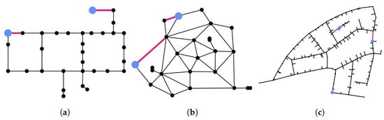 (a) Hanoi; (b) Anytown; (c) Neptun. The three water distribution network considered. Pressure sensors are placed on top of junctions and are highlighted in blue. Flow sensors are placed on top of pipes and are highlighted in red.