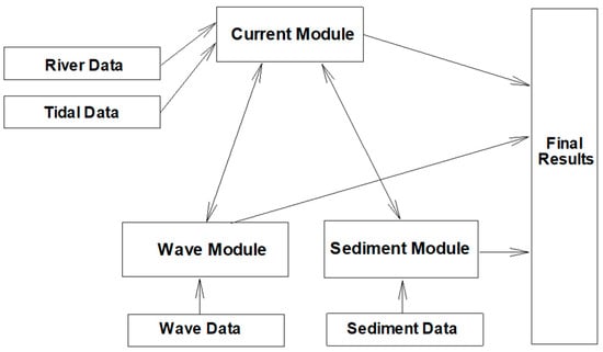 In this study, the wave–current–sediment integration is based on the one-model one-mesh approach. One model and one single unstructured mesh are used for all three sub-models. The three are coupled tightly within the same time step without using a separate coupling time interval for data exchanges as used in [29] for CCHE2D-Coast and [60] for Delft3D-SWAN. According to [60], the choice of the coupling time interval is not straightforward. The interval is often chosen to save computational time, rather than to represent the correct physical process. The effect of the applied coupling time interval on the accuracy of the model is questionable and has not been well studied. Figure 2 shows the diagram of the present current–wave–sediment integration workflow. Note that the “River Data” in the figure refers to the flow discharge and sediment rates from an upstream river—both water and sediment are delivered to an estuary area and can be included in the present model. Therefore, the present model can be used as river-only simulation, coast-only modeling or mixed simulation. The present modeling framework is linked to and may contribute toward the so-called watershed-coast system morpho-dynamics modeling as reviewed in [61].