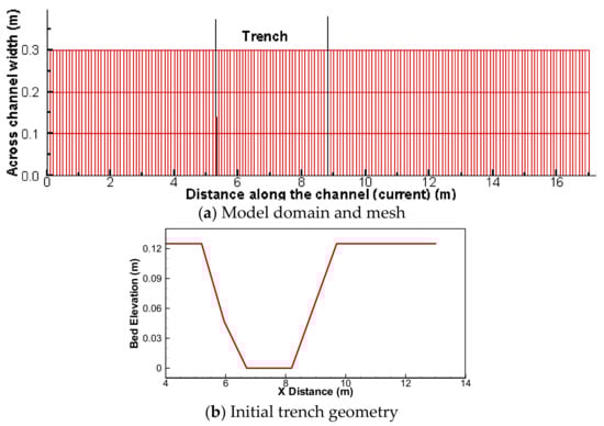 The first case is the sediment infilling and migration process in a trench under the combined flow and wave actions with the two in the same direction. The experimental case was reported by van Rijn [62]. The flume was a rectangle of 17 m in length and 0.3 m in width (see Figure 3a); the water depth was 0.5 m. A trench was created perpendicular to the flow direction and its initial geometry is shown in Figure 3b. The trench had a depth of 0.125 m, bottom width of 1.5 m and side slope of 1:10.