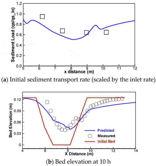 Predicted (lines) and measured (symbols) initial sediment transport rate and the bed elevation at 10 h for the van Rijn case.