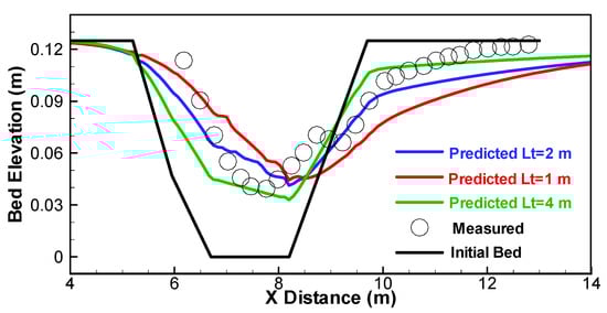 Among the sensitivity studies carried out to identify important input parameters, the adaptation length is singled out to be the most important and discussed further. Three adaptation lengths, 1.0 m, 2.0 m and 4.0 m, are used for the sensitivity study and the predicted trench bed morphology is compared in Figure 5. It is seen that the morphology is very sensitive to the adaptation length. Deposition on the upstream (left) bank increases with decreasing adaptation length, while erosion (migration) on the downstream (right) bank increases. This finding reflects the fact that the flow is highly unsteady and non-equilibrium sediment processes dominate. The results point to the importance of adopting the non-equilibrium sediment model as well as the need to develop an improved way to obtain the adaptation length for simulation.