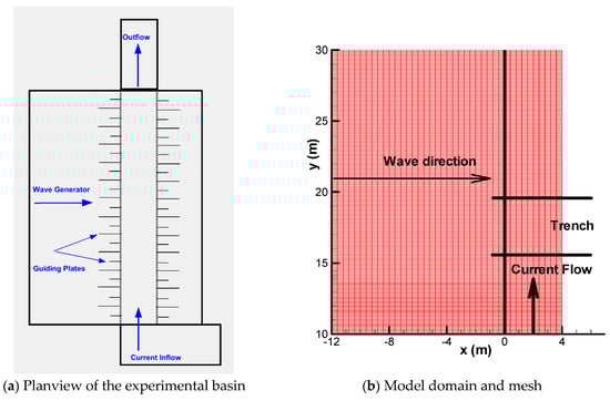 The experimental basin is sketched in Figure 6a (see [63] for details]. An initial channel of 4.0 m in width was created in the basin using the guiding boards to confine the current flow within the channel. An initial trench was prepared across the channel—its centerline was 16.75 m from the flow entrance (not shown in Figure 6a). The trench had a bottom width of 0.5 m, top width of 3.5 m and depth of 0.2 m. During the experiment, clear waters entered the channel and an almost equilibrium sediment concentration was established before entering the trench. The current velocity across the channel was almost uniform; upstream of the trench, the average velocity was 0.246 m/s, the water depth was 0.419 m and the sediment transport rate was 0.0174 kg/m-s. The channel bed consisted of uniform sand with of 0.1 mm and fall velocity of 6.54 mm/s. Further, random waves were generated by a directional wave generator and propagated normally to the channel (or flow).