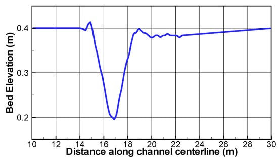 A 2D mesh is developed with a resolution of 0.1 m along the flume (170 cells) (Figure 3a). Main variables do not change across the flume so only three cells are used while the two sides are treated as symmetrical. Model inputs are based on the above measured data along with the following additional model parameters: (a) current flow Manning’s coefficient is 0.025; (b) waves have the significant wave height of 0.08 m and peak period of 1.5 s; and (c) the ripple roughness height of 1.45 mm is used to match the measured equilibrium sediment transport rate at the inlet.