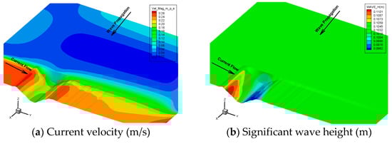 Various terms in Equation (4) need be expressed mathematically to accurately represent relevant physical processes; these include the group velocity (), wave turning rate (), frequency shifting rate ( and various wave generation and dissipation processes such as wind-generated waves, wave–wave interactions, whitecapping, wave breaking, bottom friction and wave diffraction. A detailed discussion was provided in [35] and is not repeated here.