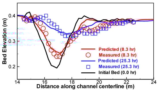 Predicted and measured trench bed elevation at two times (8.3 h and 25.3 h) for the Havinga case.