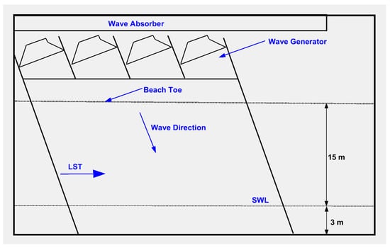 The third and final case is the wave–current–sediment dynamics in a beach surf zone typical of a near-shore coastal area. The case was experimentally studied using the Large-scale Sediment Transport Facility (LSTF) at the Coastal and Hydraulics Laboratory of the U.S. Army Engineer Research and Development Center in Vicksburg, Mississippi. The LSTF facility can generate oblique waves and produce uniform longshore currents and was described in [64,65] (see sketch in Figure 10).