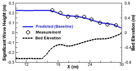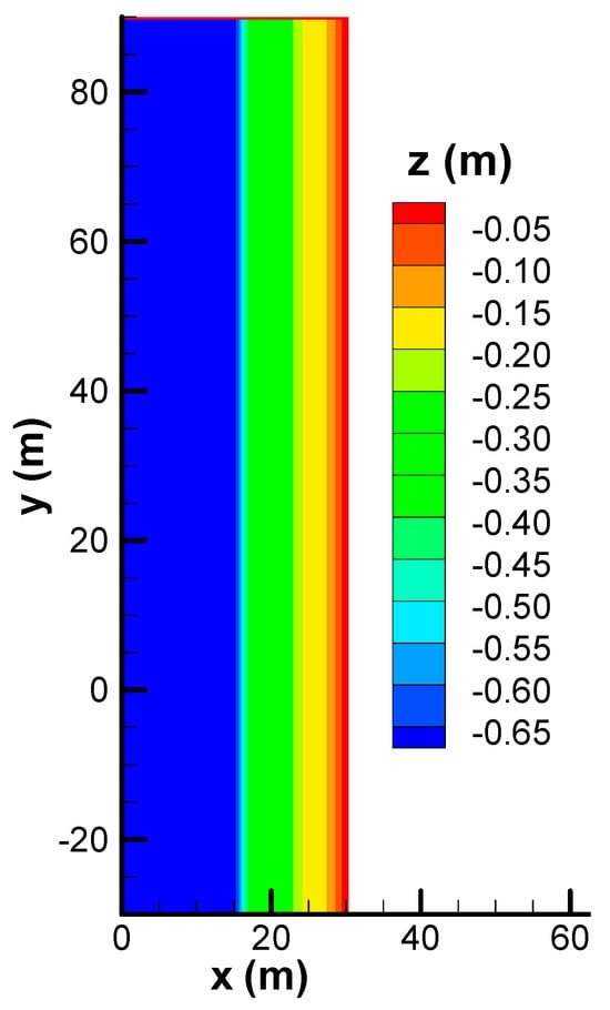 Five series of mobile-bed experiments were conducted and documented in [66,67]. Case 1 of the baseline series is chosen for the present numerical study. A uniform beach profile was constructed to represent a known equilibrium profile given the incident wave condition. Key experimental parameters are as follows [55]: (a) incident wave angle was 6.5o, significant wave height was 0.228 m and peak wave period was 1.465 s; (b) mean water level was −0.001 m; and (c) the flatbed portion on the offshore side had an elevation of −0.7 m.