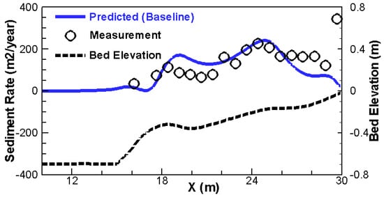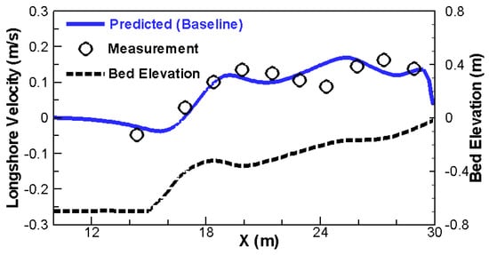 The longshore suspended load sediment rate is compared in Figure 14 and the result is also satisfactory. The two offshore sediment peaks observed in the experiment are predicted well by the model; even the locations of the two peaks are in agreement. There is an underprediction of the sediment rate in the so-called swash zone (x > 26 m). This discrepancy is expected according to [55]. The swash zone is very shallow and characterized by rapid oscillatory uprush and backwash motions which usually lead to much heightened sediment transport. This oscillatory sediment process in the swash zone is highly 3D in nature and not taken into consideration in the present 2D model.