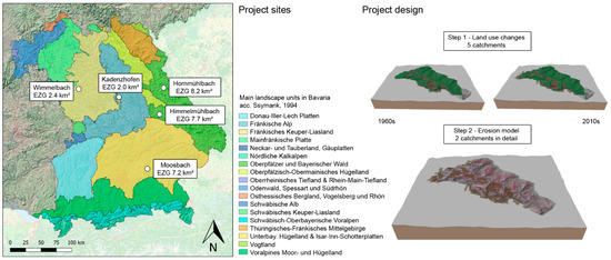 The change in landscape structures in the Bavarian Alpine foothills is elaborated on and presented by the example of five project areas that are distributed widely across the intensively used cultural land in Bavaria in order to cover different landscape units and different geological conditions (Figure 1). The areas were selected rather randomly. There were specifications from the Bavarian Fisheries Association regarding the regions known to have fine sediment problems in its waters, and the catchment areas had to be between 1 and 10 km2 in size, as this has proven to be a good scale in the past for depicting the changes [33,37]. Furthermore, old aerial photographs from the post-war period had to be available. The selected catchments cover very different landscape types that are distinguished in Bavaria according to [38]. The geological conditions, slope gradients, and precipitation data represent the range of possible conditions in the Bavarian Alpine foothills and other similar parts of Central Europe. The resulting land use coverage and soil erosion rates were related to land use distributions and calculations provided by the state offices [39,40,41] and also, in this case, consistent assumptions resulted.