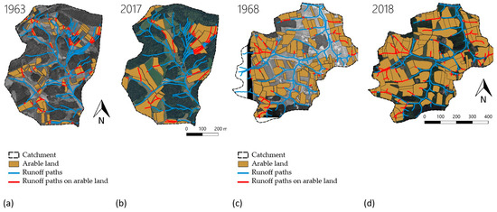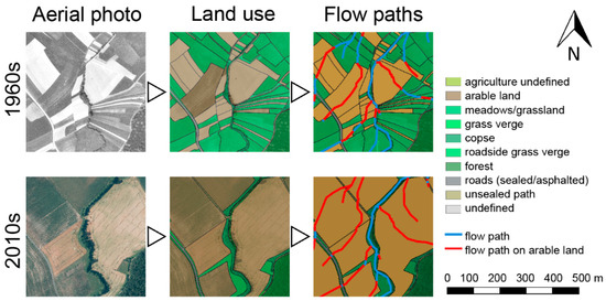 The basis for the analysis was the digitization of aerial photographs from the 1960s (aerial surveys by the American allies after World War II from the years 1963 to 1968) and from the 2010s (2016–2018) in QGIS 2.18 (www.qgis.org, CC BY-SA 3.0) by the project team (Figure 1 and Figure 2). These were, at the time of this study, the earliest and most recent aerial photographs available that allowed a distinction of land uses. The landscape changes observed within those five decades, as well as the changes in the resulting uninterrupted runoff paths on arable land, were evaluated (for details, see Section 2.2). The land use was digitized for both time steps and assigned to land use categories such as forestry, agriculture subdivided into grassland and arable land or not assignable, settlements, roads, and paths, as well as to “green” landscape elements, e.g., hedges. Moreover, the quality of the orthophotos allowed differentiation of the farm tracks and roads in terms of their sealing.