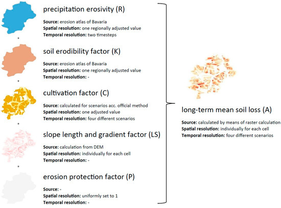 In the second step (Figure 1), erosion rates were calculated on the basis of the Revised Universal Soil Loss Equation (RUSLE [24,25,26,27]). The result of the RUSLE is a long-term mean soil loss in tons per hectare and year (A, t ha−1 a−1). The formula reads as follows: