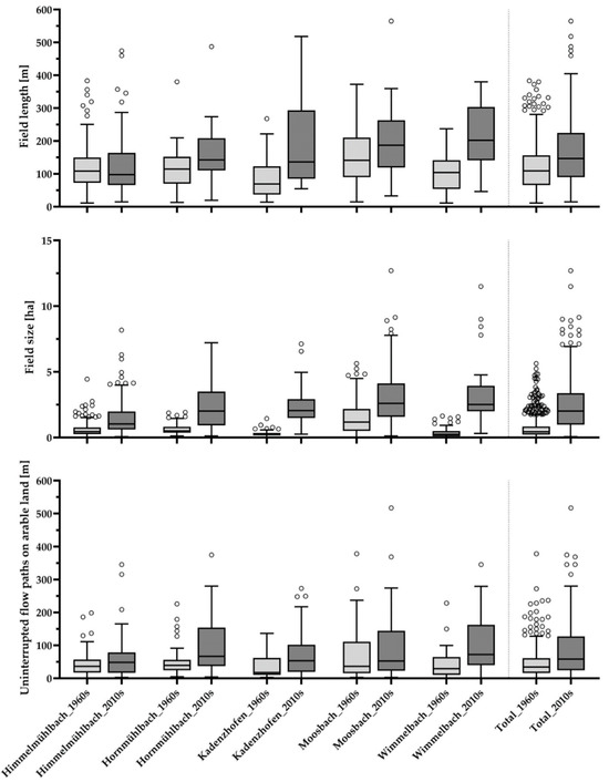 - The median length of the fields increased by more than one-third (+35%). Figure 3 shows this increase in the median from 109 m in the 1960s to 147 m in the 2010s. The maximum (without outliers) was 280 m in the 1960s and increased to 404 m within five decades. The median field length decreased slightly from 108 m to 98 m in the Hornmühlbach catchment, with maximum values having increased all the same.