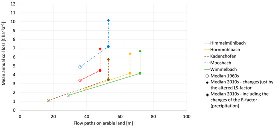 Depending on the underlying geological and hydrological conditions, different erosion rates for a respective generalized maize field were predicted in each of the five catchments. Figure 5 shows the relationship between slope lengths (in this case the runoff paths on arable land) and soil erosion on each standardized maize field. As the slope (S), the cover and cultivation factor (C), and the soil protection factor (P) were assumed to be identical in all catchments, the differences in the 1960s time step values in Figure 5 are driven by the local soil erodibility factor (K), the differences in the rainfall factor (R), and the runoff path length at that time. The mean erosion rates over catchments in that scenario range from 1.11 to 4.88 t ha−1a−1. The increase in the erosion rate is determined by the lengthening of the flow paths, and thus the changed LS factor led to values from 3.45 to 7.18 t ha−1a−1 for the 2010s time step. Depending on the catchment area, this results in an increase by a factor of 1.33 to 3.12. The additional adjustment of the R-factor [9,42], which was necessary due to the climatic changes, accounts for a further significant increase in erosion rates, resulting in mean catchment values from 5.75 to 10.15 t ha−1a−1. Overall, this resulted in increases between the two time steps by factors between 2.06 and 5.20, with the latter value standing out. On average, there was a threefold increase (3.18) in mean soil erosion in the five catchments for the maize field outlined.