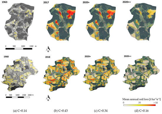 In a further step, the RUSLE model was applied to the whole area of two catchments, the Hornmühlbach and the Moosbach. The required input parameters for both time steps were derived from actual land use and topography (LS-factor) or taken from provided maps (R-factor, K-factor) and finally combined as raster-based spatial information in QGIS and calculated individually for each cell using the raster calculator (Figure 3). Four scenarios were developed for the C-factor (cover and management factor) in order to reflect the changes in land use (Table 2). While the first two scenarios aim at depicting the conditions in the 1960s and 2010s realistically, the 2020+ and 2020++ scenarios predict the effects of erosion control measures of varying effectiveness on the fields. The 2020+ scenario includes measures that are relatively often used nowadays, such as intercropping (cultivation of plants that maintain and strengthen soil fertility between actual crops when the soil would otherwise be without cover) and undersowing (cultivation of plants that maintain and strengthen soil fertility below maize and other row crops), with proportions of row crops remaining high. The 2020++ scenario considers far-reaching changes in agricultural management, such as no-tillage or a significant reduction in row crops, such as maize. The resulting C-factors were calculated by means of the tool provided by the Bavarian Regional Office for Agriculture [43] (see Table 2).