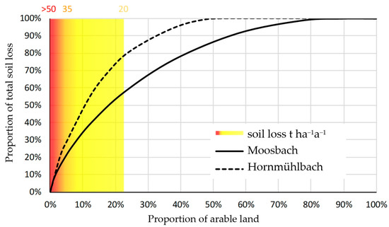 In order to quantify the proportion of land required for erosion control measures, the results of the erosion modeling are depicted as a cumulative line of land use in Figure 7. The vertical axis shows the share of total erosion and the horizontal axis shows the share of arable land where erosion occurs. The two functions represent the respective results of the two catchments and reflect their different characteristics such as use, management, or topography. The slope in the diagram represents the erosion per unit area. The yellow-orange-red marked area shows the proportion of land that exceeds soil erosion values of 20, 35, and 50 t ha−1a−1, respectively. Areas with increased erosion values only take up about 22% of the arable land but cause 60% to 80% of the erosion in the two model catchments, depending on the respective underlying conditions.