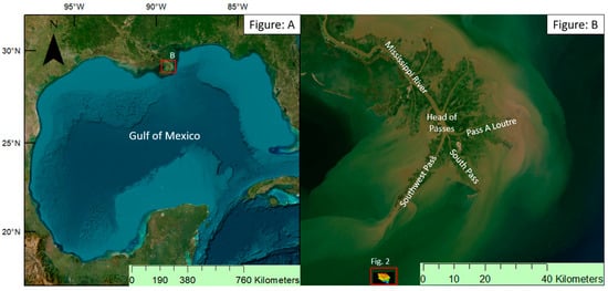(A) Map of the Gulf of Mexico showing the location of the study area, B, within the gulf. (B) Map showing the Birdsfoot delta, within the Gulf of Mexico, highlighting the anatomy of the main distributary network.