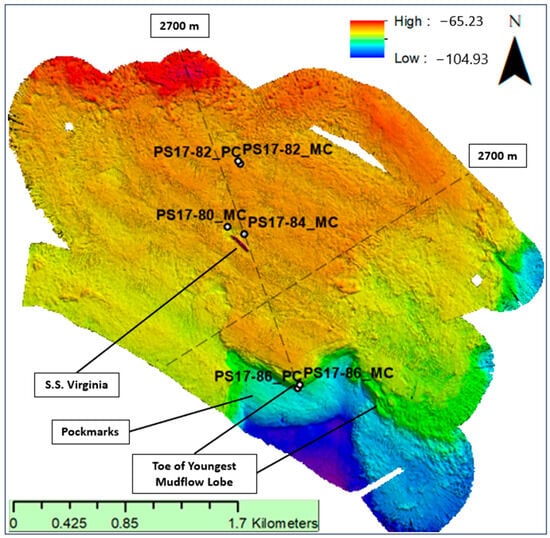In June 2017, a U.S. Geological Survey (USGS) cruise on the R/V Point Sur conducted a high-resolution geophysical survey across the MRDF [,]. A second cruise in 2017 led by Louisiana State University (LSU) collected piston cores and multicores (Table 1) from specific depositional settings mapped by the USGS. Samples were collected using a Benthos piston corer (core diameter of 7.5 cm), capable of collecting cores of up to 8 m depth in seabed, and an Ocean Instruments MC-800 multicorer (core diameter of 10 cm), that collects sediment with limited disturbance up to 50 cm depth. Observations during core collection of all piston cores revealed evidence of gas expansion when processing cores on deck. Piston cores PS17-82-PC and PS17-86-PC were selected to provide data on opposing sides of the shipwreck site. Multicores PS17-80-MC and PS17-84-MC were selected due to their central positioning on the lobe as well as being ~80 m and ~50 m from the Virginia. PS17-86-MC was added for comparison with its piston core PS17-86-PC in order to account for sediment non-recovery from the top 50 cm of the corresponding piston core. The positioning of the selected cores can be seen in Figure 2. Rectangular slabs were extracted from multicore tubes onboard the ship for subsequent imaging, and one multicore tube per deployment was extruded and sliced at 2 cm intervals for radiochemical and granulometric measurements, with subsamples refrigerated in sealed plastic bags until analysis.