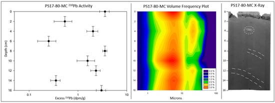 Excess 210Pb, grain-size frequency plot, and X-radiographic imaging of multicore PS17-80-MC, immediately north of SS Virginia. X-radiographic images display higher density sediment as darker gray shades, lower density sediment as lighter gray, and voids as white. The white dashed lines in the X-radiographic image highlight burrows outlined by iron flakes.