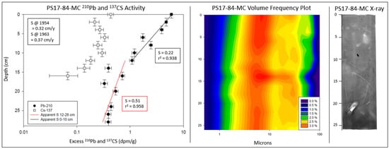 PS17-86-MC shows three distinct zones of excess 210Pb, with 137Cs detectable only in one sample at 4 cm depth (Figure 5). The 210Pb activity over 0–6 cm depth shows a steep sub-vertical log–linear decline. At 8–14 cm, a regular but less vertical decline is evident, below which the profile is vertical and irregular. The uppermost two zones define a profile consistent with marine–sedimentary 210Pb analyses [], influenced mostly by bioturbation in the upper zone, and mostly by sediment accumulation in the lower zone, with radioactive decay active throughout. For regression analysis, the middle zone of the 210Pb profile yields a sediment accumulation rate of 0.29 cm/y for 8–14 cm (Equation (2)). Using this value for sediment accumulation in a regression of Equation (4) over the 0–6 cm zone yields Db ≈ 6 cm2/y (Table 2). The irregular vertical basal profile of excess 210Pb suggests rapid deposition or mixing in this interval. If the 0–6 cm were SAR only, the SAR only regression (Equation (2)) would be 0.42 cm/y. The presence of a single detection of 137Cs at 4 cm is difficult to assess. Two possibilities include earliest introduction (1954) or peak value (1963). If it were the first introduction, then sediment rates based on 137Cs since 1954 would be 0.13 cm/y or less, depending on effects of bioturbation. If it were the peak value, then sediment rates based on 137Cs since 1963 would be 0.15 cm/y or less, depending on the effects of bioturbation.