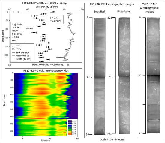 Excess 210Pb and 137Cs profiles, grain-size frequency plot, and X-radiographic imaging of piston and multicore PS17-82-PC, MC, at the northmost portion of the mud lobe. X-radiographic images display higher density sediment as darker gray shades, lower density sediment as lighter gray, and voids as white.
