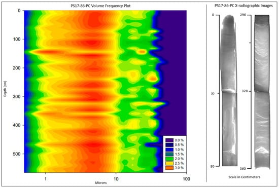 Grain-size frequency plot and X-radiographic imaging of piston core PS17-86-PC, at the toe of the mud lobe. X-radiographic images display higher density sediment as darker gray shades, lower density sediment as lighter gray, and voids as white.