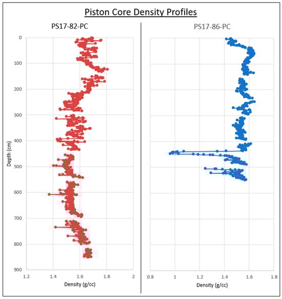 Density profiles of piston cores PS17-82 and PS17-86 at their respective depths. Artifacts in density measurements created by open voids were removed.