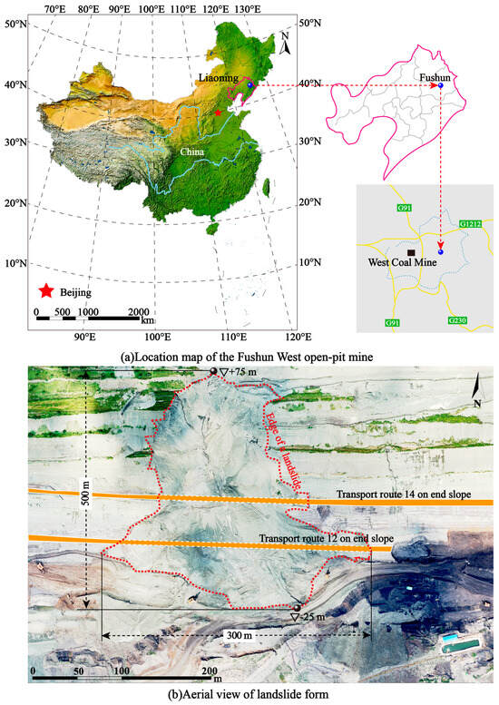 Location of the study area and geomorphology of the open-pit mine: (a) Location map of the Fushun West open-pit mine; (b) aerial view of landslide form.