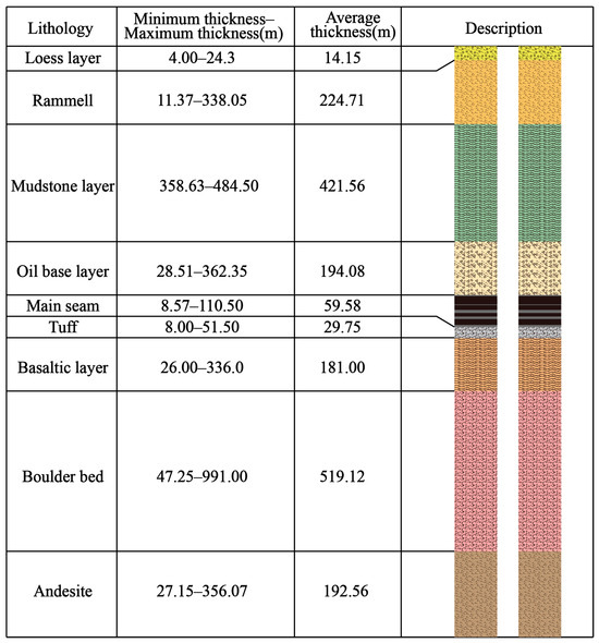 By studying the exploration data of the initial mining area, along with a large volume of geological exploration information and conducting geological surveys, the rock masses of the slopes in the Fushun West open-pit mine have been classified into various lithologies, including granite gneiss, basalt, coal, oil shale, tuff, green mudstone, and miscellaneous fill soil. The exposed strata, from the oldest to the youngest, mainly consist of Precambrian granite gneiss, Paleogene Paleocene Lao Hutai Formation, Lizigou Formation, Eocene Guchengzi Formation, Jijuntun Formation, and West Open-Pit Formation. Quaternary artificial deposits also exist in the area. A comprehensive stratigraphic column is shown in Figure 2, and a profile of the landslide area is presented in Figure 3.