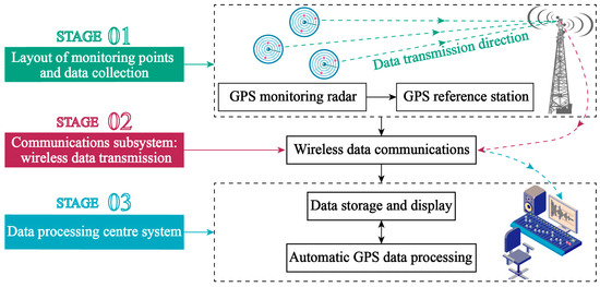 In order to reduce the threat of landslide disasters in open-pit mines to national property and people’s lives, the Fushun West open-pit mine introduced a GPS real-time monitoring system, whose framework is shown in Figure 4. The system realizes the 24 h uninterrupted monitoring of geological disaster bodies and the remote automatic transmission of landslide displacement monitoring data, providing effective technical guarantees for the early warning of disaster bodies and the activation of emergency plans.