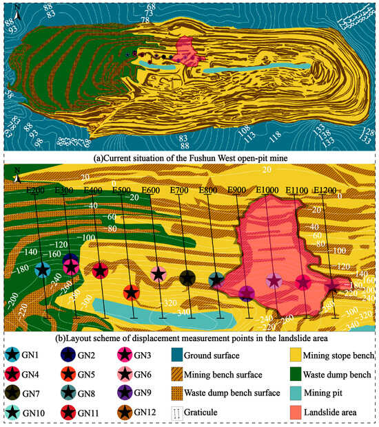 Landform and diagram of the open-pit mine landslide: (a) current situation of the open-pit mine; (b) layout scheme of displacement measurement points in the landslide area.