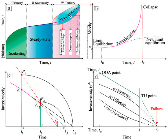The failure mechanism of slopes is defined as a complete paroxysmal collapse of rock and soil material. By analyzing a multitude of triaxial compression laboratory tests and in situ monitoring research, researchers have discovered that the deformation process of most landslides complies to the progressive characteristics [34,35,36] and three-stage law [37,38,39,40], as shown in Figure 6a. The whole process, from the initial deformation to the eventual failure, representatively comprises three stages: decelerating (green proportion), steady-state deformation (blue proportion), and acceleration deformation (pink proportion). Although the described methods have occasionally been successfully applied to a variety of cases such as man-made walls [30,41], rock and soil specimens [42,43,44], volcanic eruptions [45,46], or tunnels [45,47], these methods are primarily applied to unstable slopes. Hence, landslides are regarded as the principal research objects.