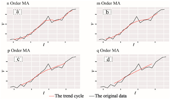 The SSBF and LSBF models are customizable because they can be calculated for different numbers of time cycles (also called the order of the moving average). The biggest distinction of the SSBF and LSBF models is over setting the length of time cycles (k). Significantly, there is no regularly precise guideline or standard definition to set up the boundary between short-term and long-term cycles. It is noted that the selection of a suitable time cycle (k) value is due to the following two major elements: (i) monitoring data accuracy/quality; and (ii) data sampling frequency. To observe what the trend-cycle estimate looks like under different orders of moving average, we plot it (Figure 7) along with a group of monitoring data from an anonymous open-pit mine. It should be noted that the trend cycle (in red) is smoother than the original data after processing several moving averages (n < m < p < q) and captures the main movement of the time series without any of the minor fluctuations.