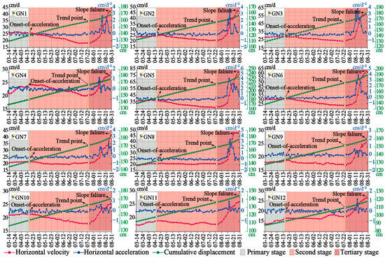 As shown by the blue curve in Figure 8, in the first two stages, the acceleration curve fluctuates above and below 0, and the fluctuation range is the smallest in the whole stage. In the second stage, the acceleration curve is above 0 as a whole and shows an upward trend of fluctuation. The fluctuation range of the acceleration curve in the third stage is the largest in the whole stage, and the overall trend of fluctuation is decreasing. In terms of numerical value, the acceleration data of monitoring points in the whole stage reached the highest point on 14 August. The minimum absolute value of acceleration, which was −0.13 cm/d2, was measured by the monitoring point GN11 on 13 July. The maximum acceleration, which was 4.30 cm/d2, was measured by the monitoring point GN5 on 14 August. The acceleration value span of GN10 is the smallest, ranging from −0.2 to 0.65 cm/d2. The acceleration value of GN5 at the monitoring point has the largest span, ranging from −0.2 to 4.30 cm/d2.
