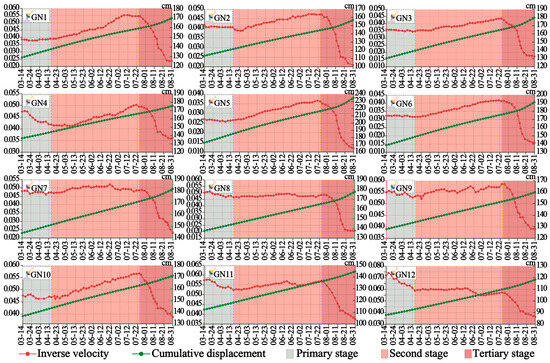 According to the displacement–reverse velocity curve and the accumulated displacement curve drawn at 12 monitoring points, as shown in Figure 9 the trend of the reverse velocity curve mainly experienced three stages: slow acceleration, upward convex deceleration, and upward concave deceleration in the whole period. In the first stage, the reverse velocity curve showed an overall upward trend, but the upward trend was gentle. In the second stage, the inverse velocity curve presents an upward convex deceleration trend. The inverse velocity curve of the third stage showed an upward concave deceleration trend and finally reached its lowest point on 31 August. The time interval of the sharp downward trend of the curve at this stage was roughly distributed from 11 August to 15 August. In terms of numerical value, the inverse velocity data of monitoring points in the whole stage fell to the lowest point on 31 August. The minimum inverse velocity, which was 0.012, was measured by the monitoring point GN5 on 31 August. The maximum inverse velocity was measured by the monitoring point GN9 on 31 July, with a value of 0.059. The inverse velocity value span of GN4 is the smallest, ranging from 0.036 to 0.050. The inverse velocity value of GN8 has the largest span, ranging from 0.021 to 0.049.