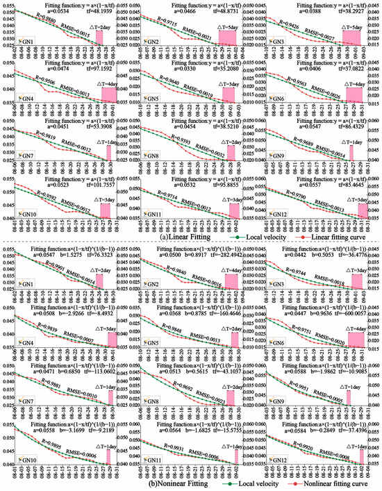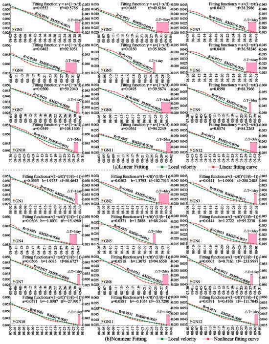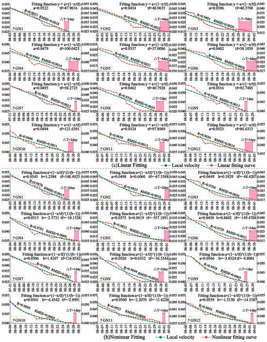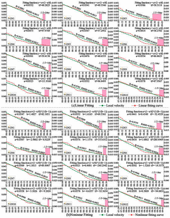 As shown in Figure 10, from 28 June 2016, the monitoring data acquisition starting point, the stage of large fluctuation ended on 31 August, and the period from 22 July to 31 August was the initial decay stage under the velocity multiplicative inverse representation. The curve trend of the 12 monitoring points is mainly presented as constant velocity attenuation–convex attenuation–concave attenuation–constant velocity attenuation. In terms of smoothness, this model is worse than other models. At the same time, since 11 August, the slope has completed the initial attenuation stage of large scale and also entered the next attenuation stage of relatively stable amplitude. At this stage, the amplitude of oscillation decreases compared with the initial attenuation stage. It is worth noting that under the representation mode of the multiplicative inverse meta-model of source velocity data, the curve shows obvious linear expression characteristics since 15 August. Linear and nonlinear fitting (as shown in Figure 10) was carried out for data under the multiplicative inverse meta-model of source velocity data. The landslide time predicted by 12 monitoring points is about 1–5 days earlier than the actual landslide time. Under the nonlinear fitting condition, the landslide time predicted by the 12 monitoring points under the model is about 1–3 days earlier than the actual landslide time, and the landslide time predicted by the GN1 and GN9 monitoring points under the model lags behind the actual landslide time by 2 days and 1 day, respectively. In terms of fitting effect and prediction effect, nonlinear fitting has better performance than linear fitting, and the overall prediction effect shows that the actual landslide time can be predicted in advance.