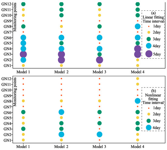 The bubble chart between the actual landslide and the predicted landslide time is drawn in Figure 14. It can be seen from the figure that all four models can effectively predict the landslide in advance. Under the condition of linear fitting, the interval between the prediction time and the landslide time is guaranteed to be within 5 days. Under the nonlinear fitting condition, the interval between the prediction time and landslide time is guaranteed to be within 4 days, whereas the monitoring data of GN1, GN9, GN10, GN11, and GN12 shorten the interval between the prediction time and landslide time to within 2 days. In terms of fitting accuracy, the multiplicative inverse meta-model (model 1) is the lowest among the four models, followed by the ESF model (model 4); the SMA model (model 2) is better, and the LMA (model 3) model is the best. In terms of prediction accuracy, from the perspective of bubble size and distribution, ESF is the lowest among the four models, followed by the SMA model; the multiplicative inverse meta-model is better, and the LMA model is the best.