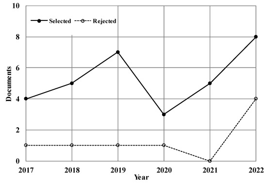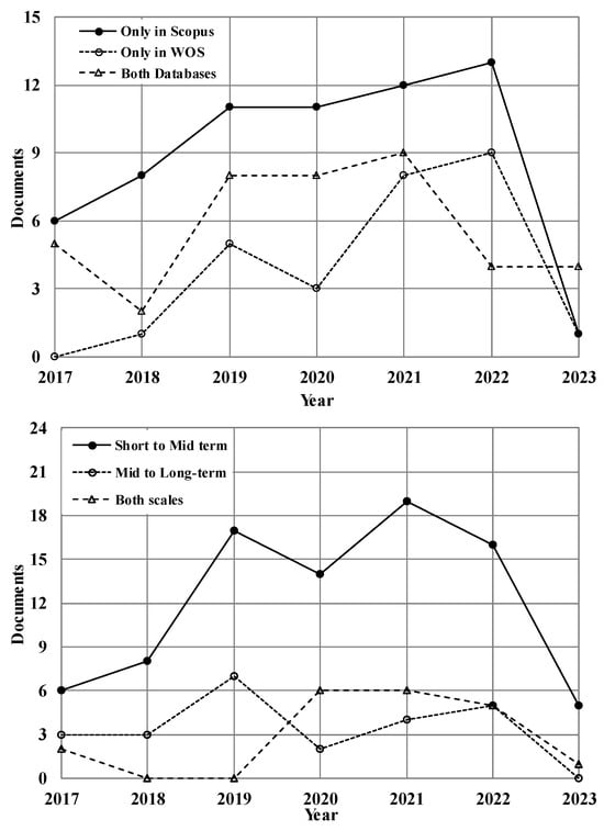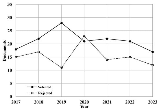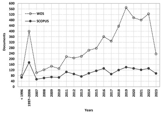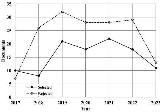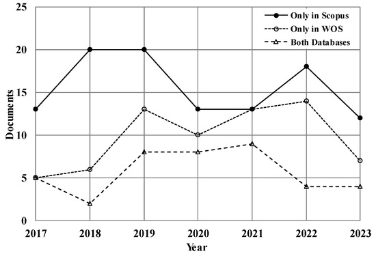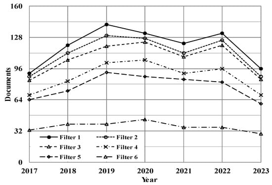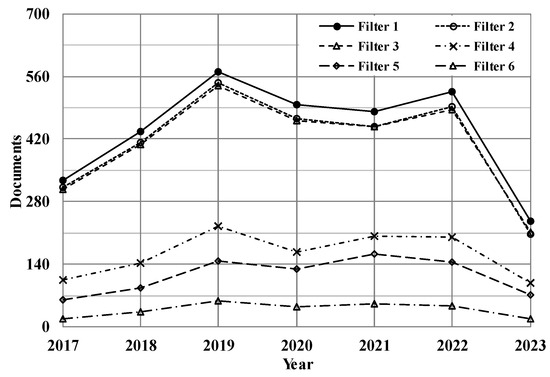 - Filter 1: The publication year from 2017 to 2023 (October) was used (see Table 2). This period was chosen to obtain trends that showed the current landscape of the field (However, at a general level, previous documents that provide important inputs should be taken into consideration). Furthermore, Figure 2 shows that 2017 saw a new ascending slope in academic production on the research topic. This filter returned 834 documents for Scopus and 3072 for the WOS.