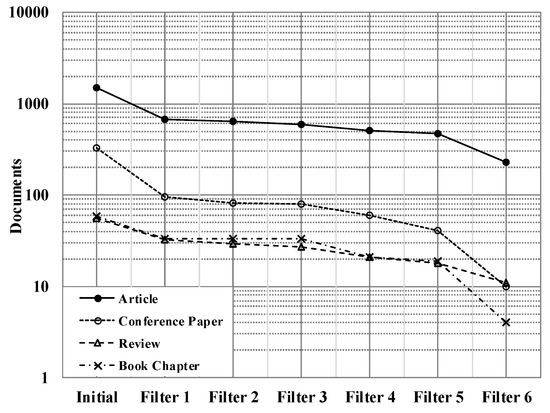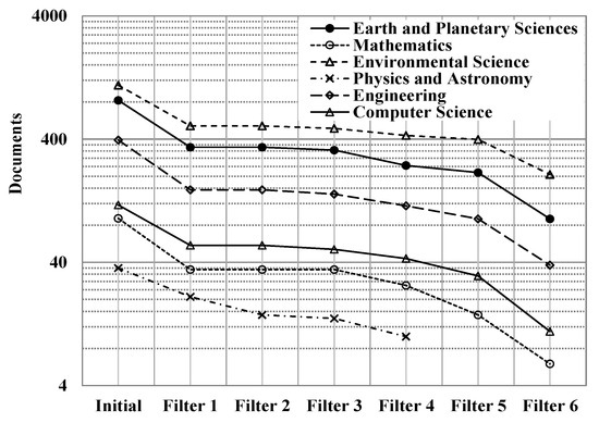 - Filter 2: The second filter was used for Scopus as the Subject Area and for WOS as the Research Area to delimit the classification area, applying the criteria presented in Table 3, resulting in 782 documents for Scopus and 2882 documents for WOS.